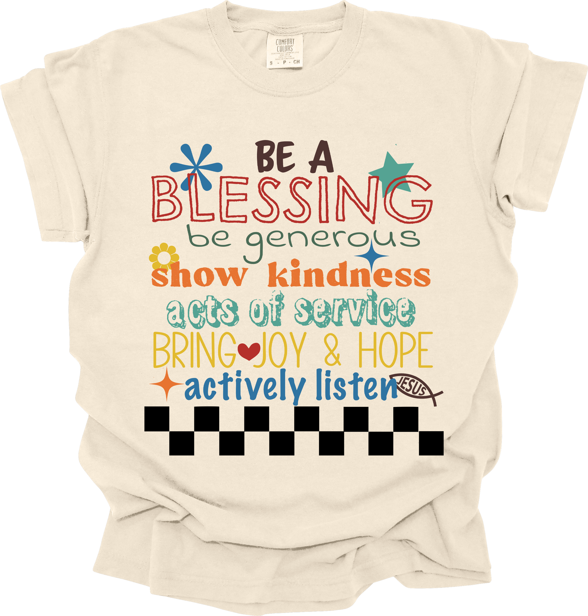 This Comfort Colors® “Be a Blessing” Tee in soft ivory is a wearable reminder to let your faith overflow into action. With its fun, retro-inspired typography and pops of color, it highlights powerful calls to kindness—be generous, show kindness, acts of service, bring joy & hope, actively listen.
