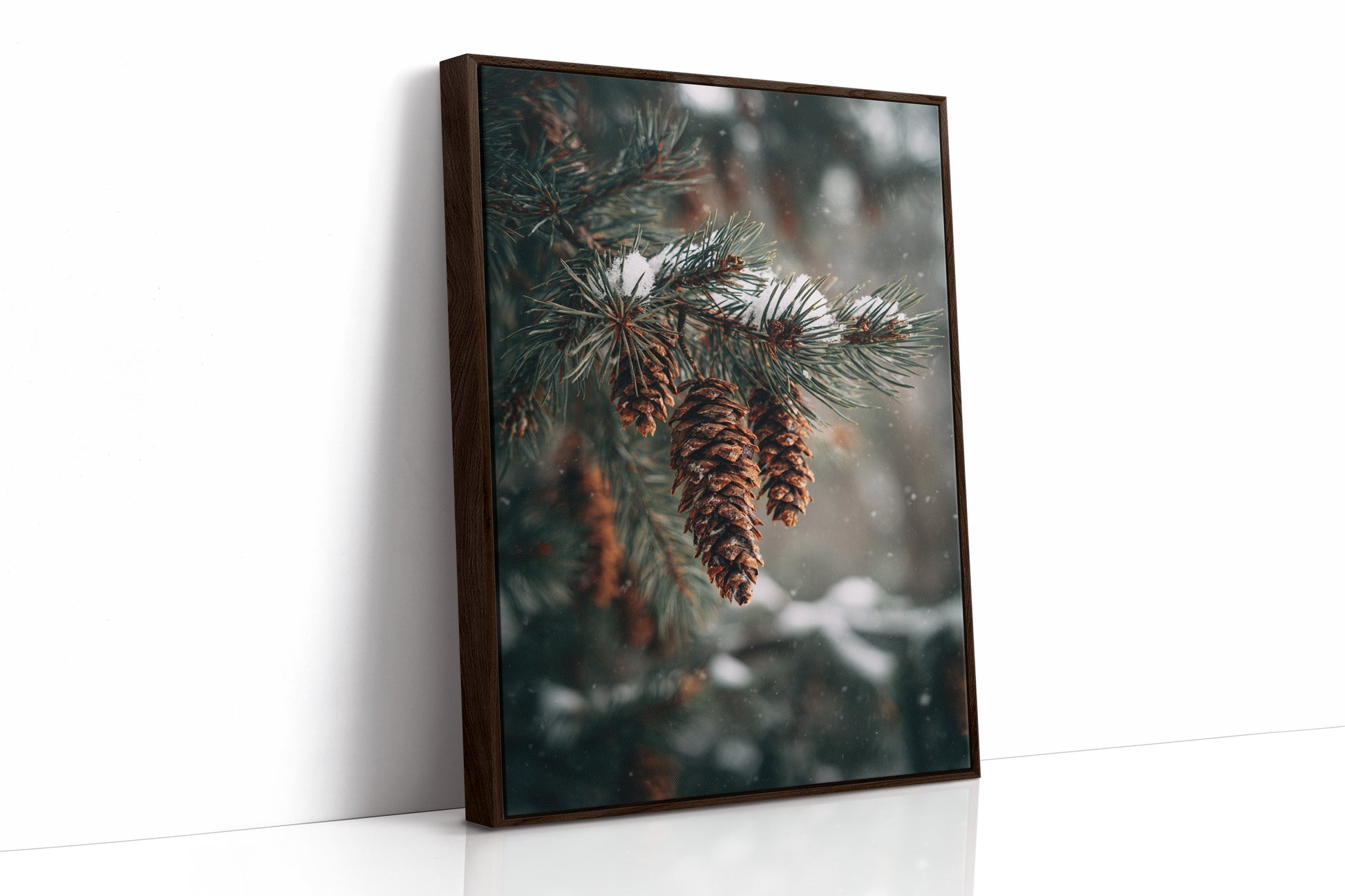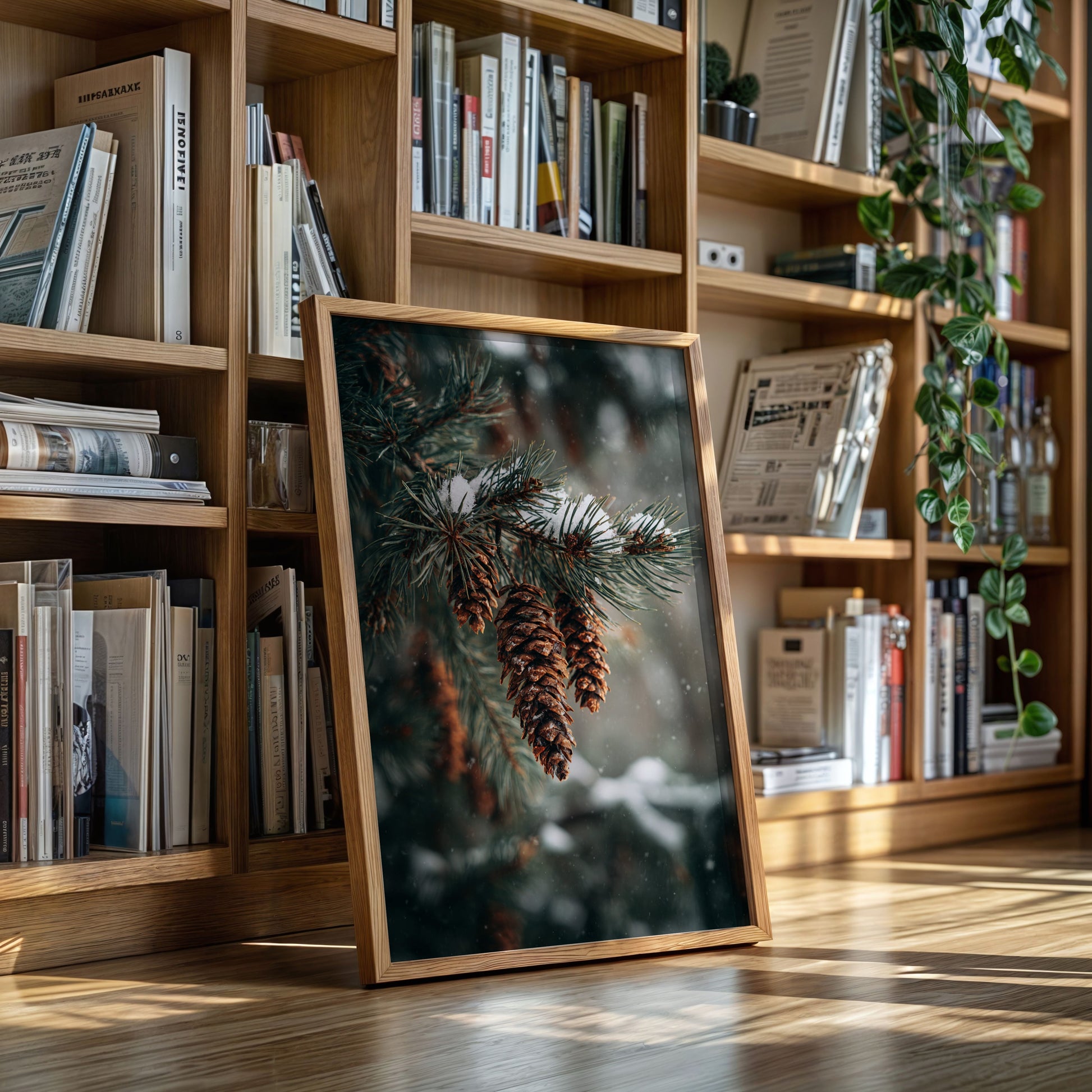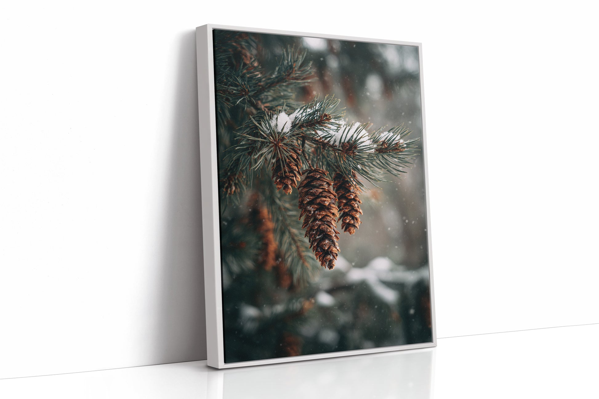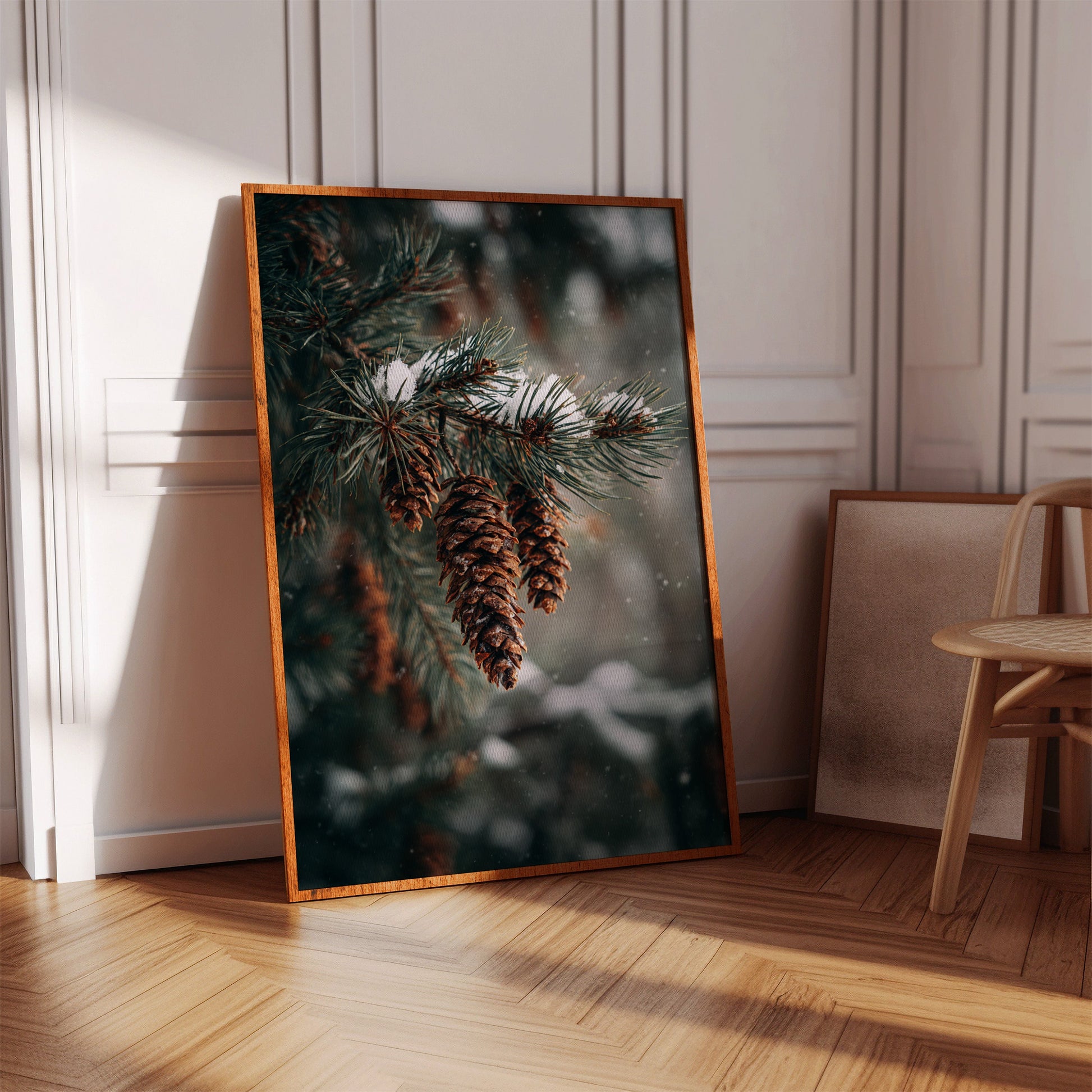 Inspired by the quiet elegance of snow-dusted pine cones, this photographic artwork crystallizes the beauty of nature's intricate designs. The artist's lens transforms simple forest scenes into a profound celebration of winter's artistry.