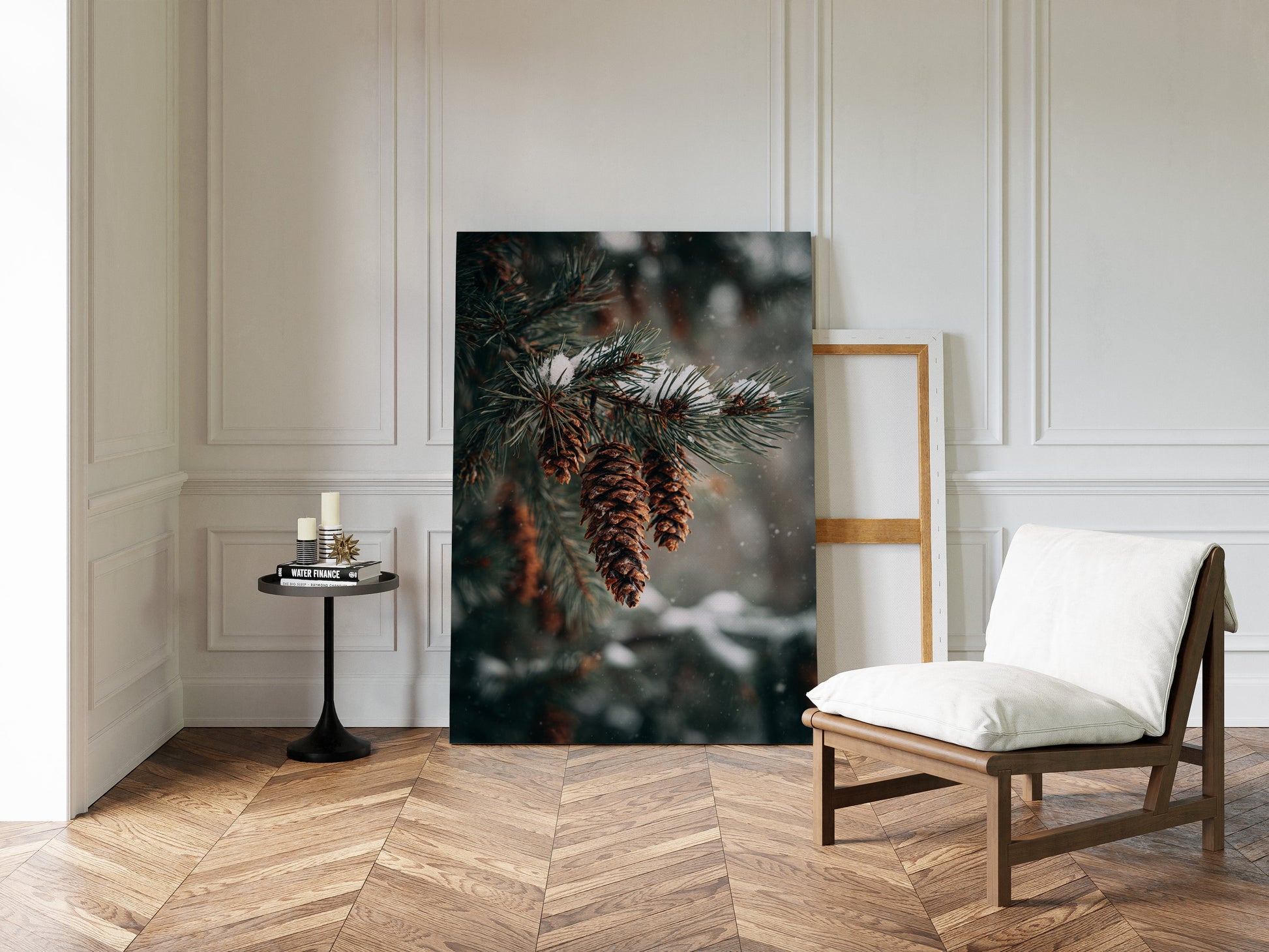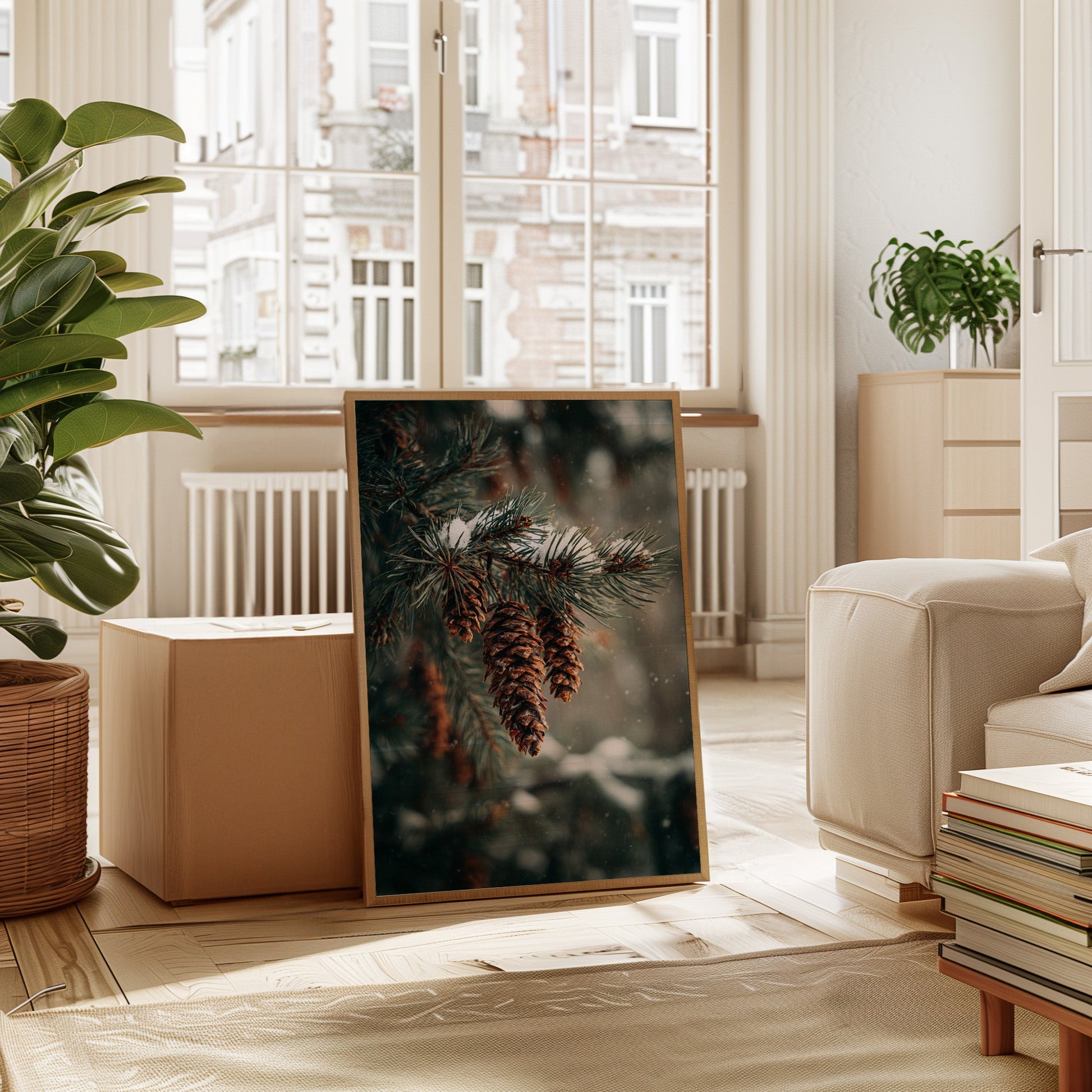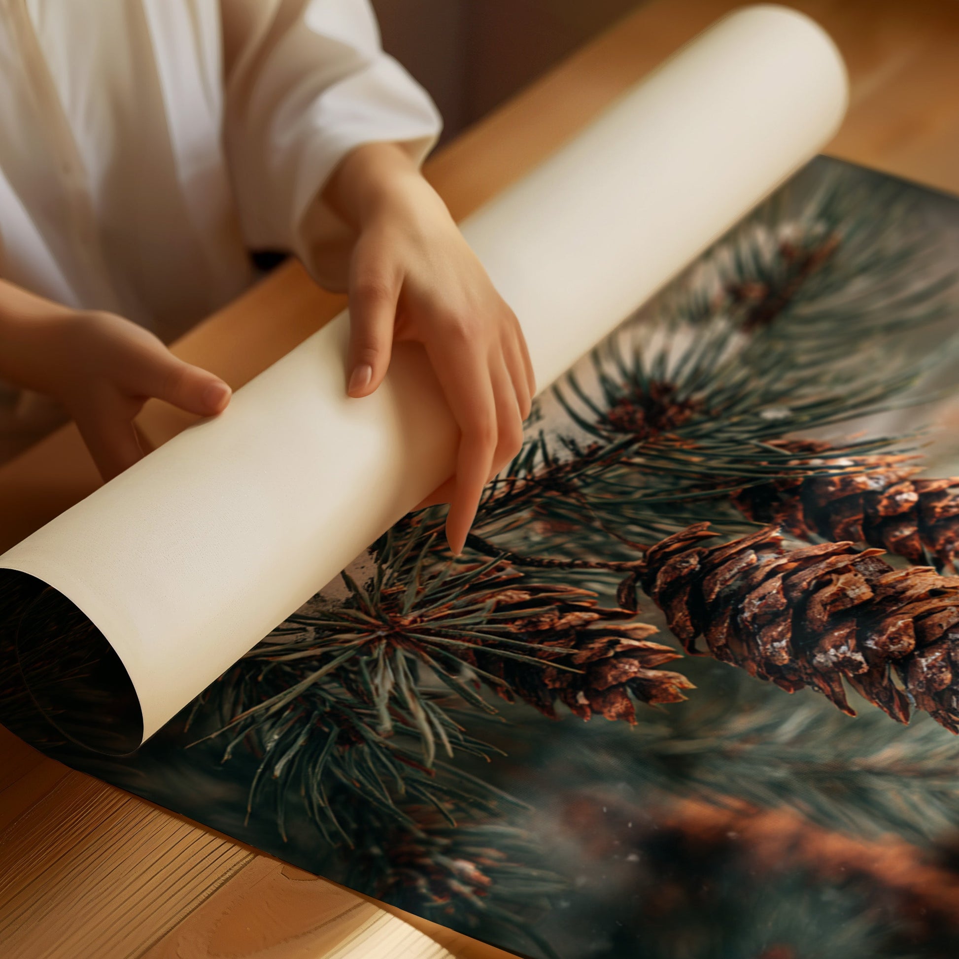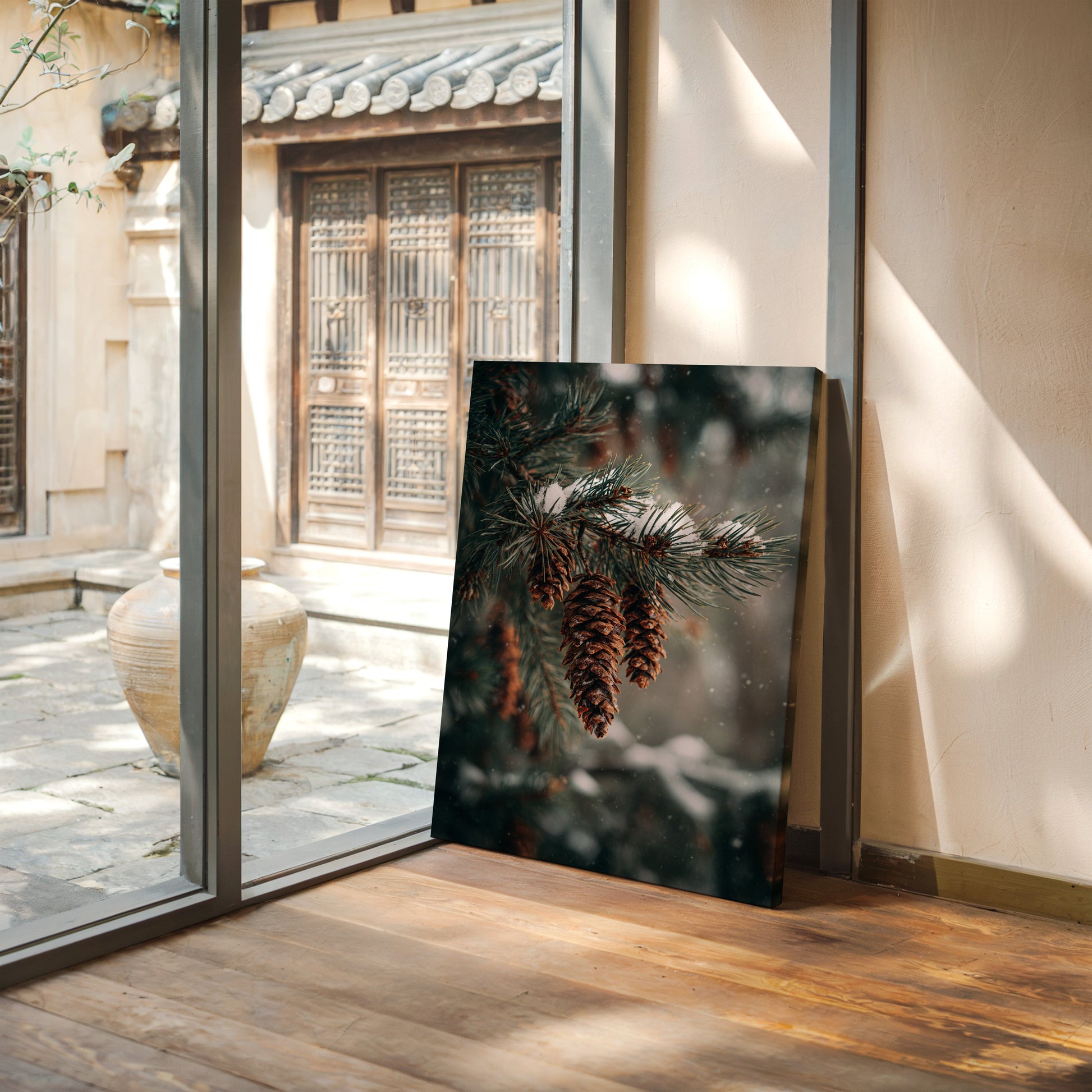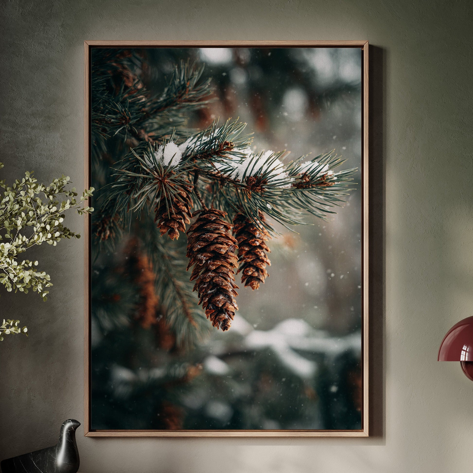 Inspired by the quiet elegance of snow-dusted pine cones, this photographic artwork crystallizes the beauty of nature's intricate designs. The artist's lens transforms simple forest scenes into a profound celebration of winter's artistry.