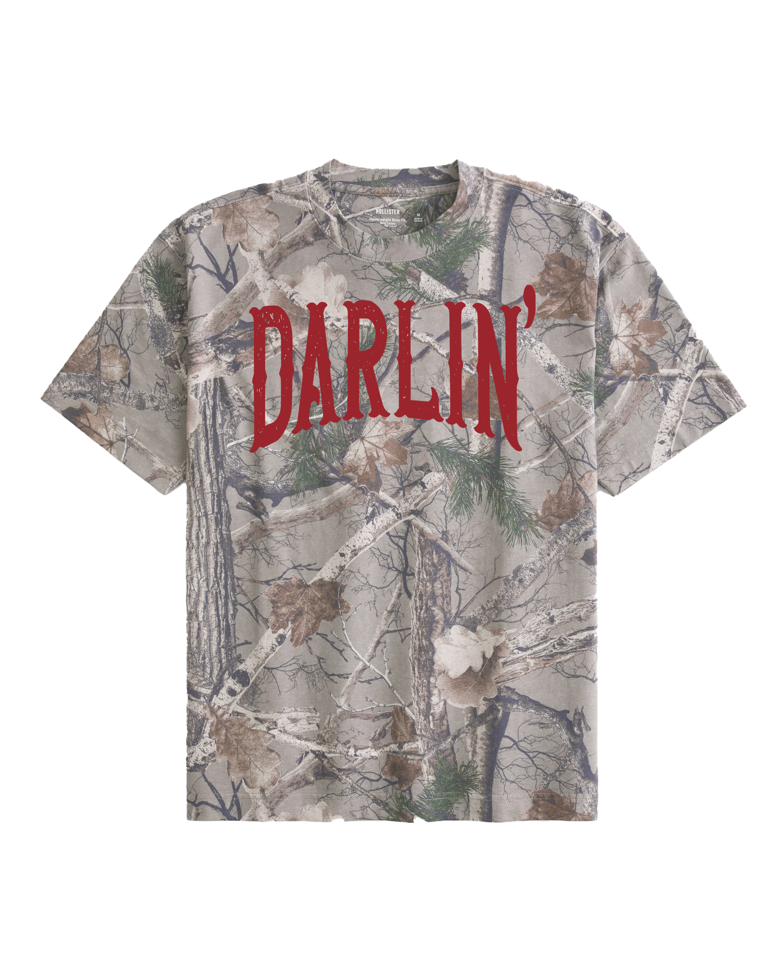 This tee features a realistic woodland camo pattern that’s totally on-trend this year — camo is everywhere, from streetwear to high fashion — and a bold “DARLIN’” graphic in deep red across the chest for the perfect mix of tough and sweet.