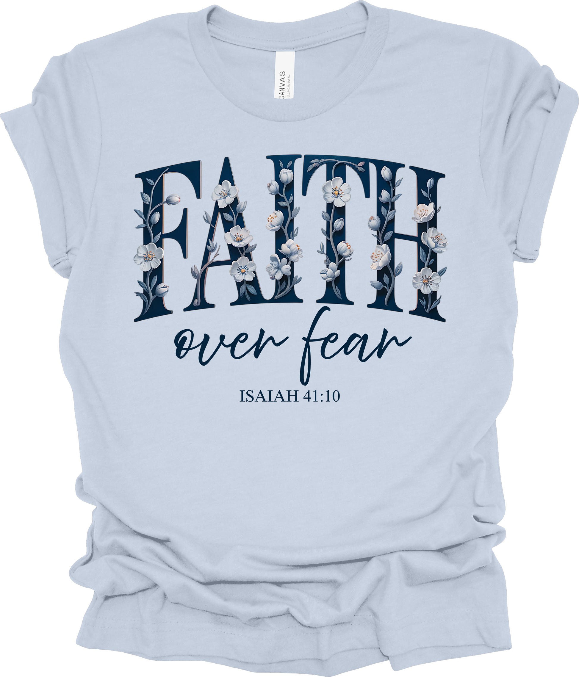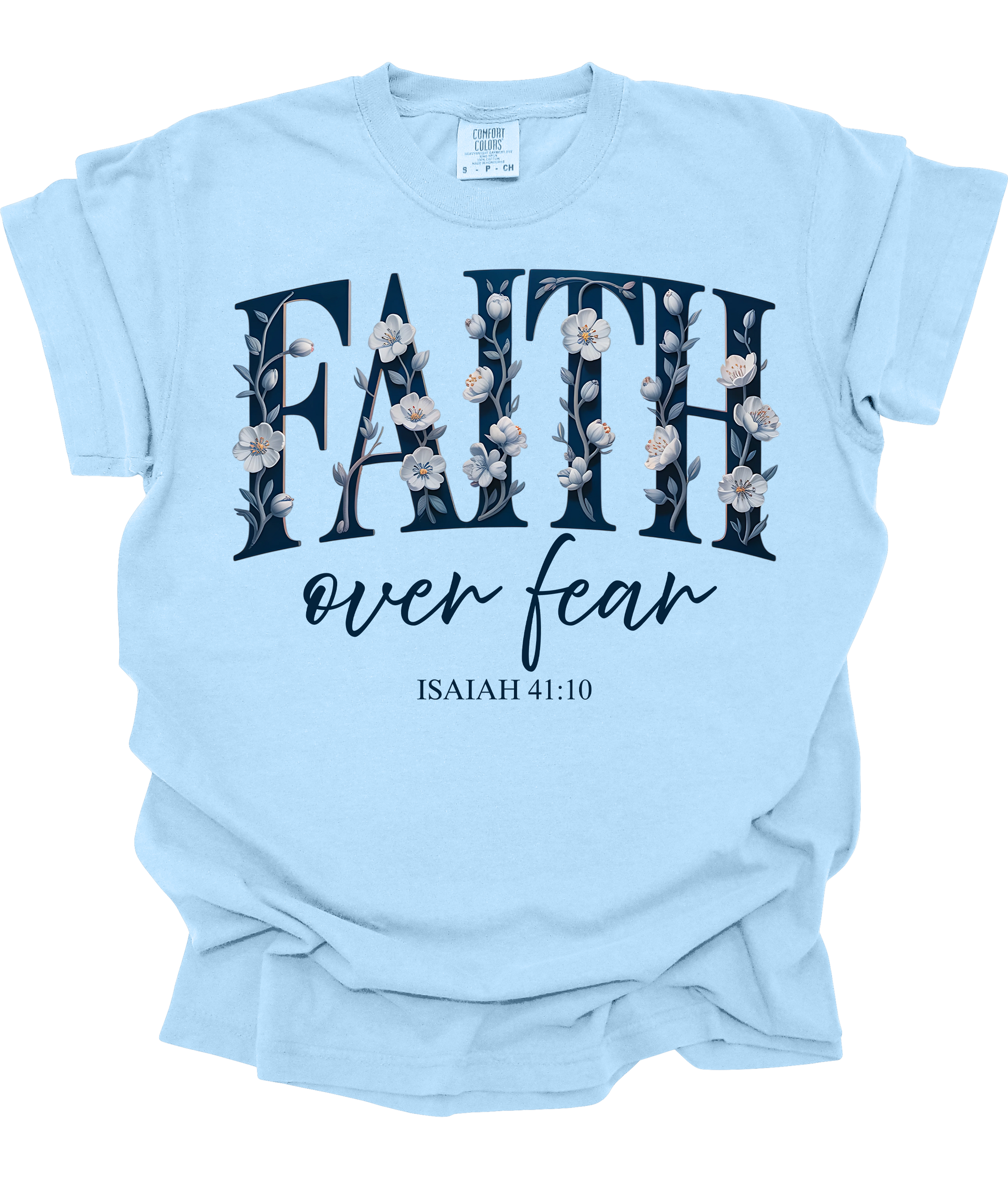 This beautifully designed tee features the powerful message “Faith over fear” inspired by Isaiah 41:10, wrapped in soft, delicate florals for a feminine and uplifting look. It’s the perfect everyday reminder to walk boldly in trust.