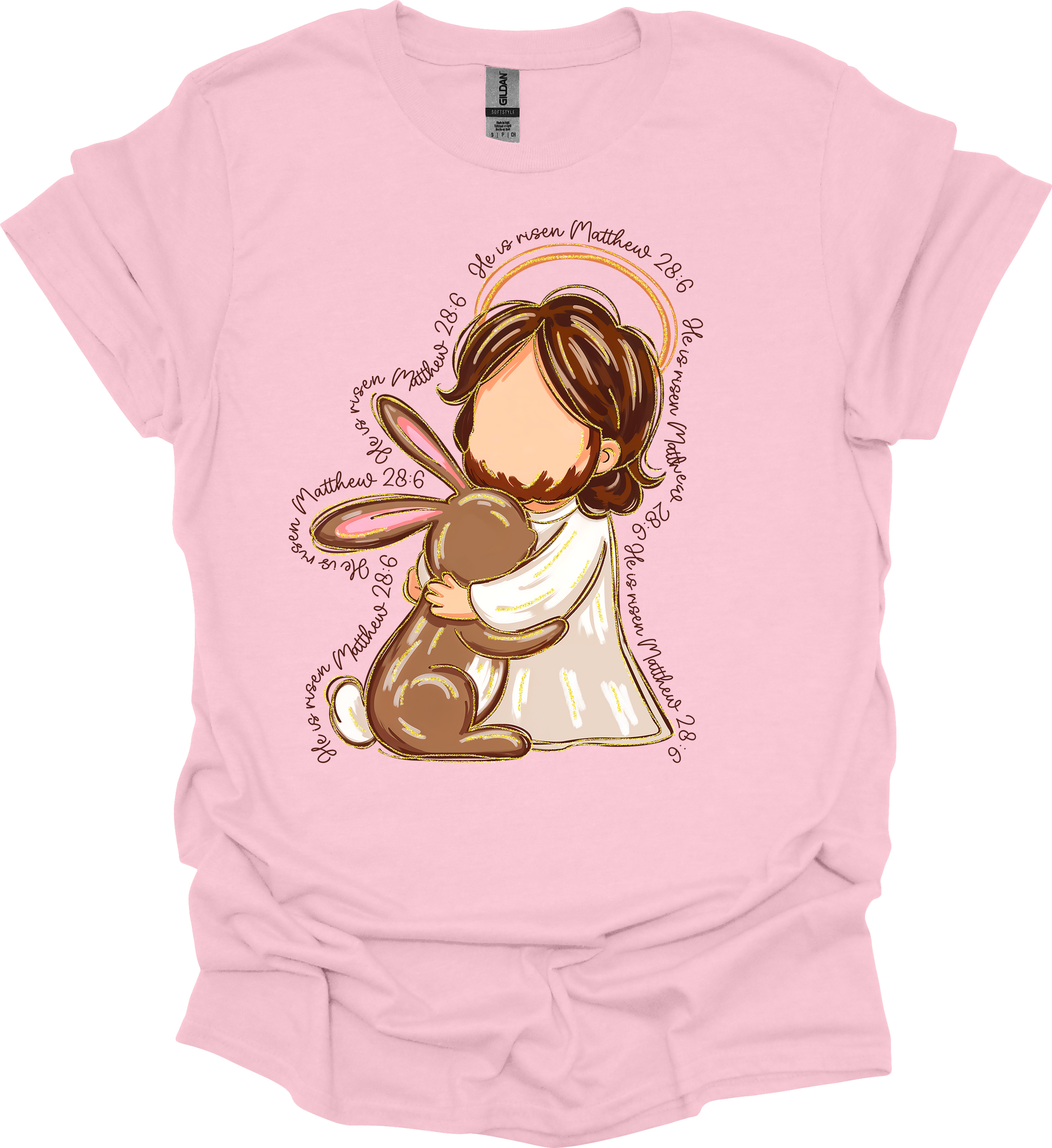 Share the joy of Easter in the sweetest way with our He Is Risen Bunny Tee, designed especially for little ones. Printed on a soft Gildan® tee in Light Pink, this adorable illustration shows Jesus lovingly holding a bunny, encircled with the scripture Matthew 28:6 – He is risen, creating a tender and meaningful design perfect for Easter.