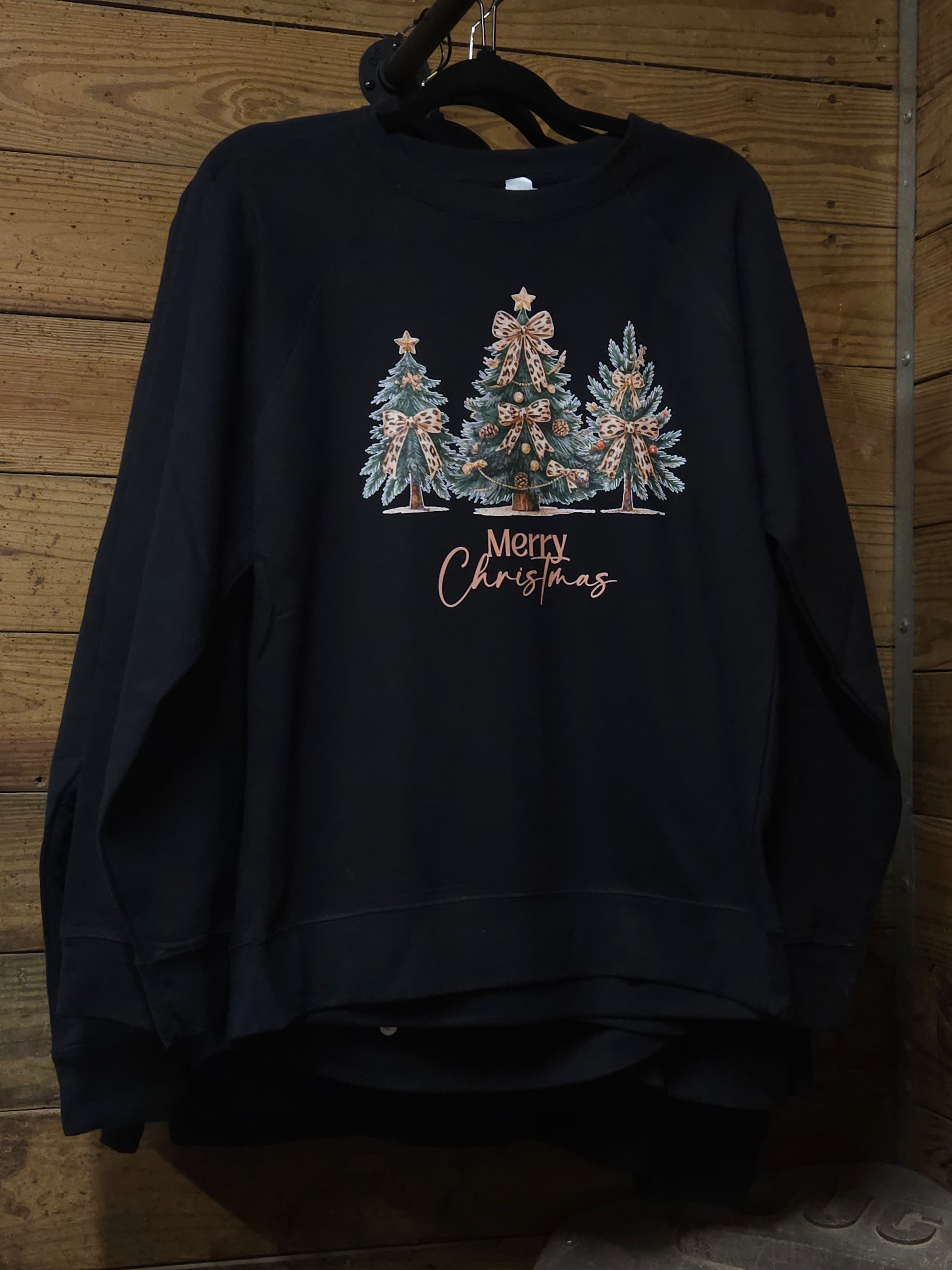 The front showcases three beautifully detailed Christmas trees adorned with leopard print bows, golden ornaments, and stars, paired with a warm “Merry Christmas” script in soft, coordinating tones. The design blends rustic charm with a touch of modern style — perfect for anyone who loves a neutral holiday look with a little flair.