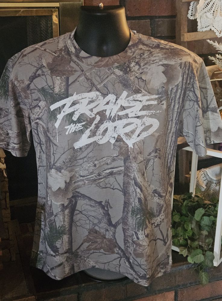 On-trend camouflage pattern with bold “Praise the Lord” graphic