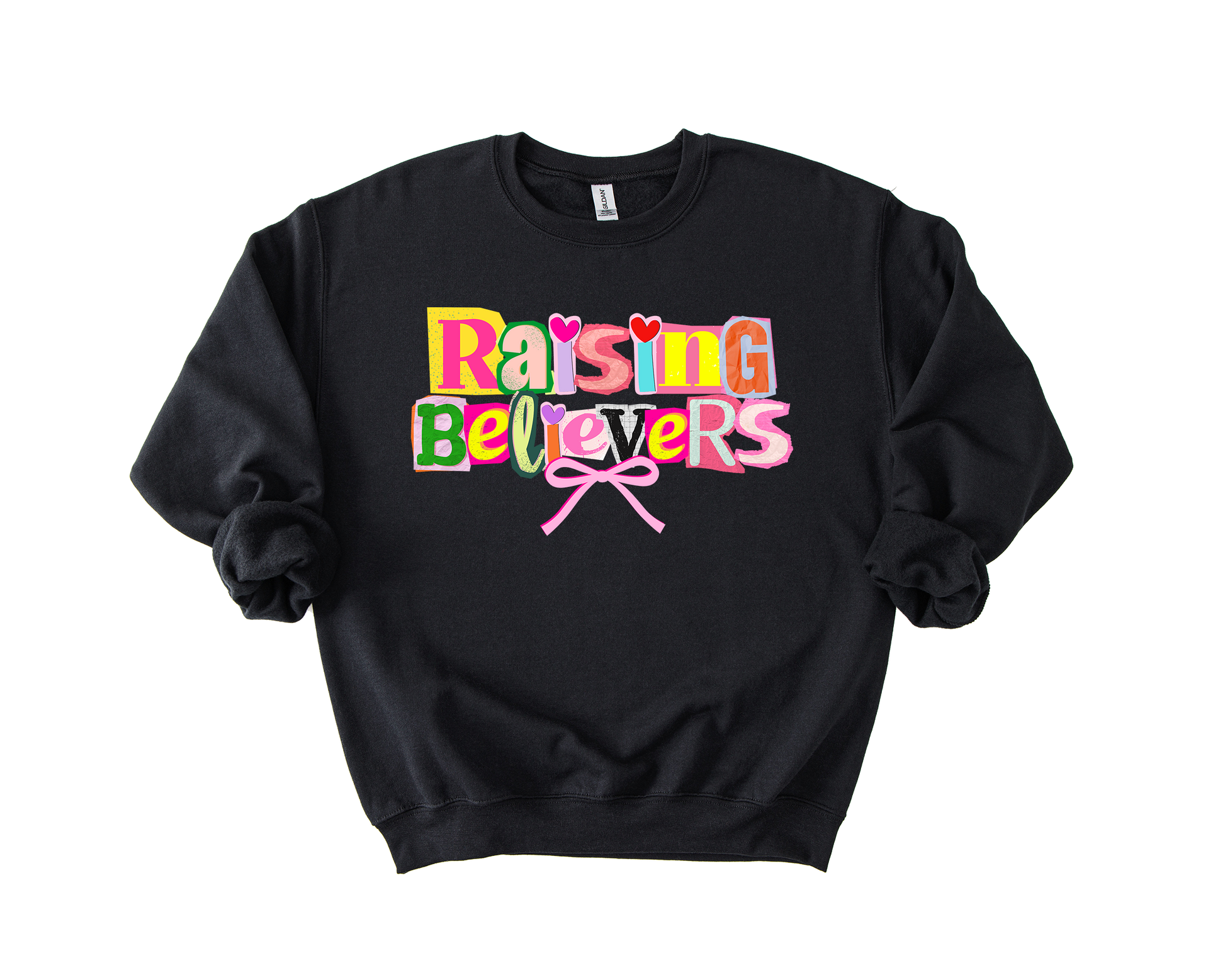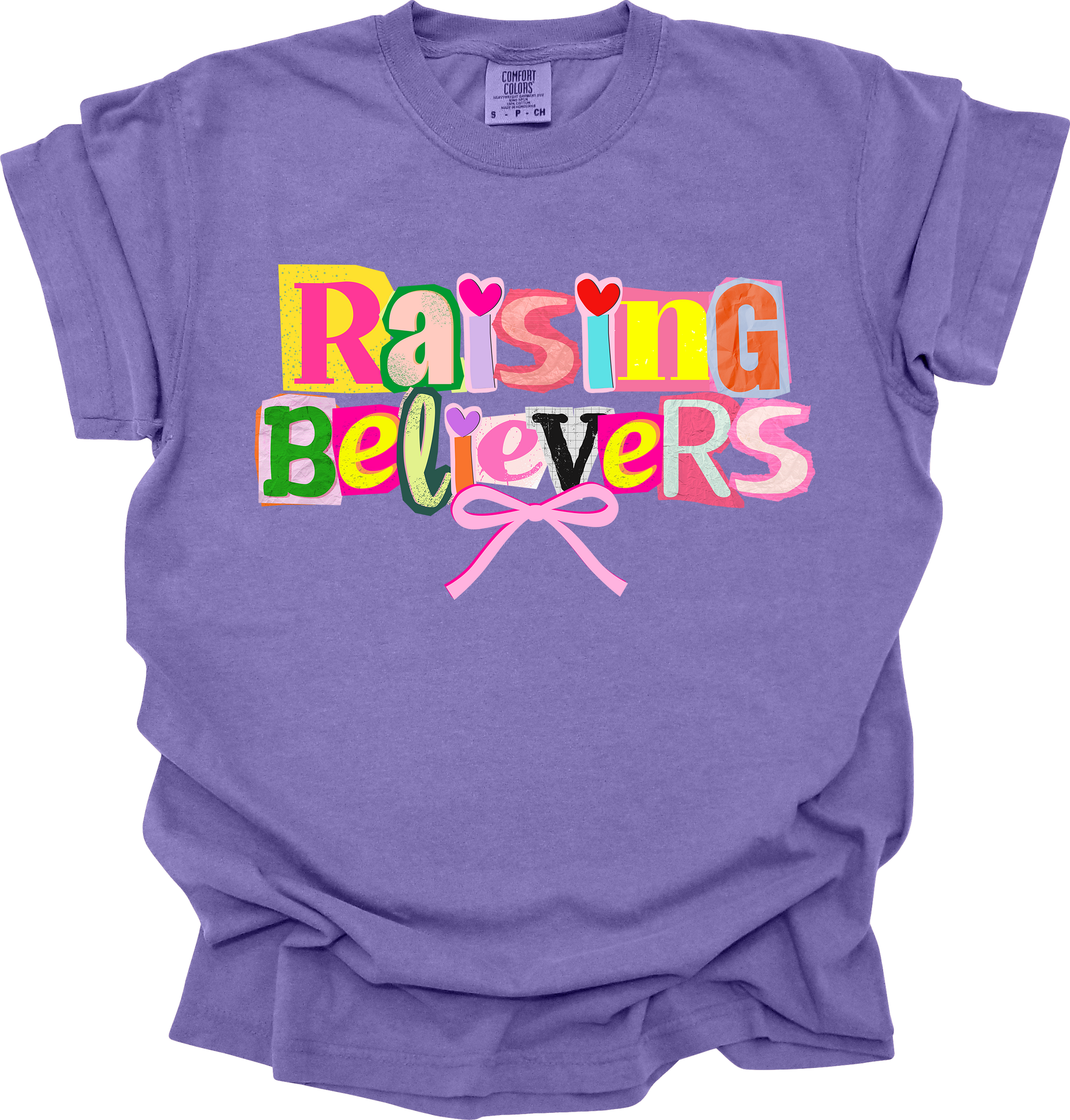 Bright, joyful, and full of heart—our Raising Believers design is made for moms, teachers, children’s ministry leaders, or anyone passionate about planting seeds of faith. This playful collage-style graphic features bold, colorful cut-out letters, sweet heart accents, and a soft pink bow that ties the whole design together. It’s cheerful, faith-forward, and perfect for everyday encouragement.