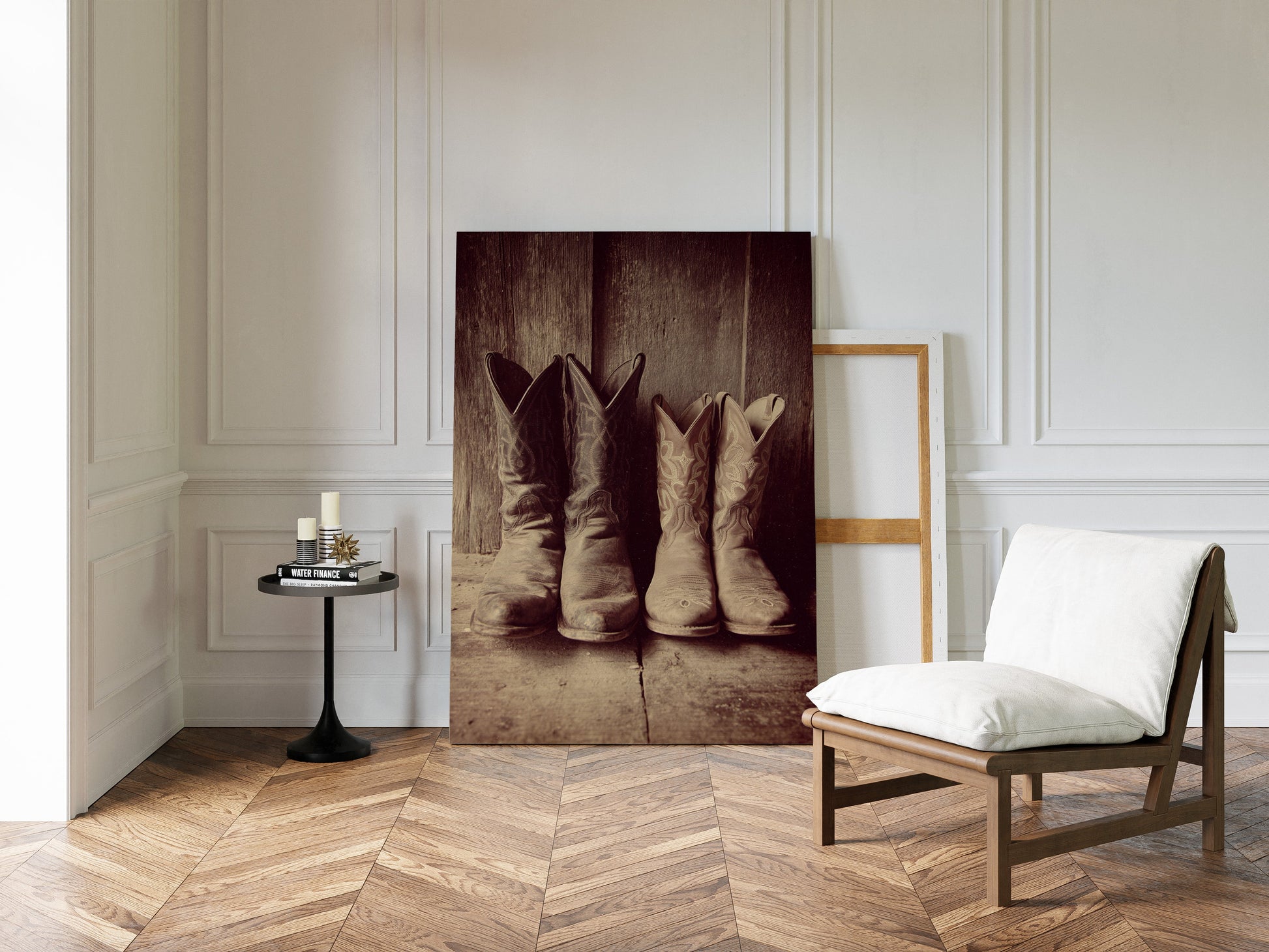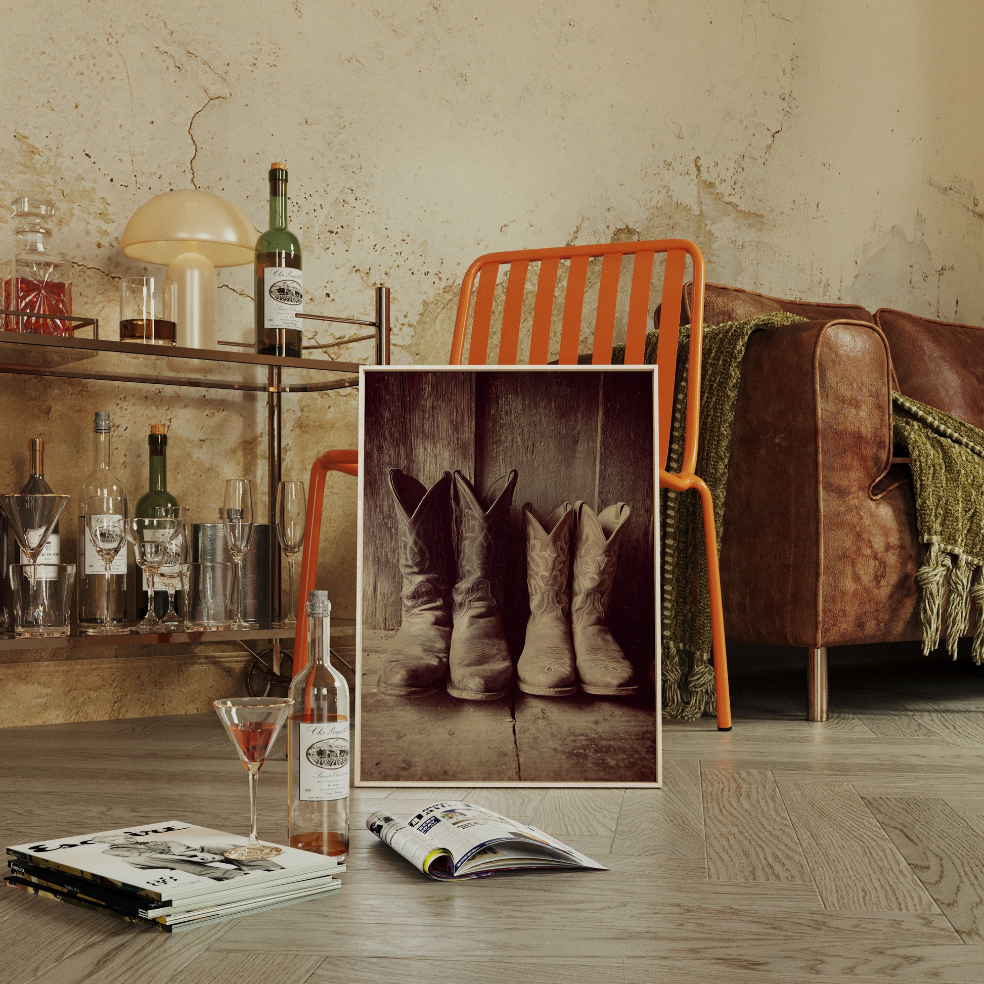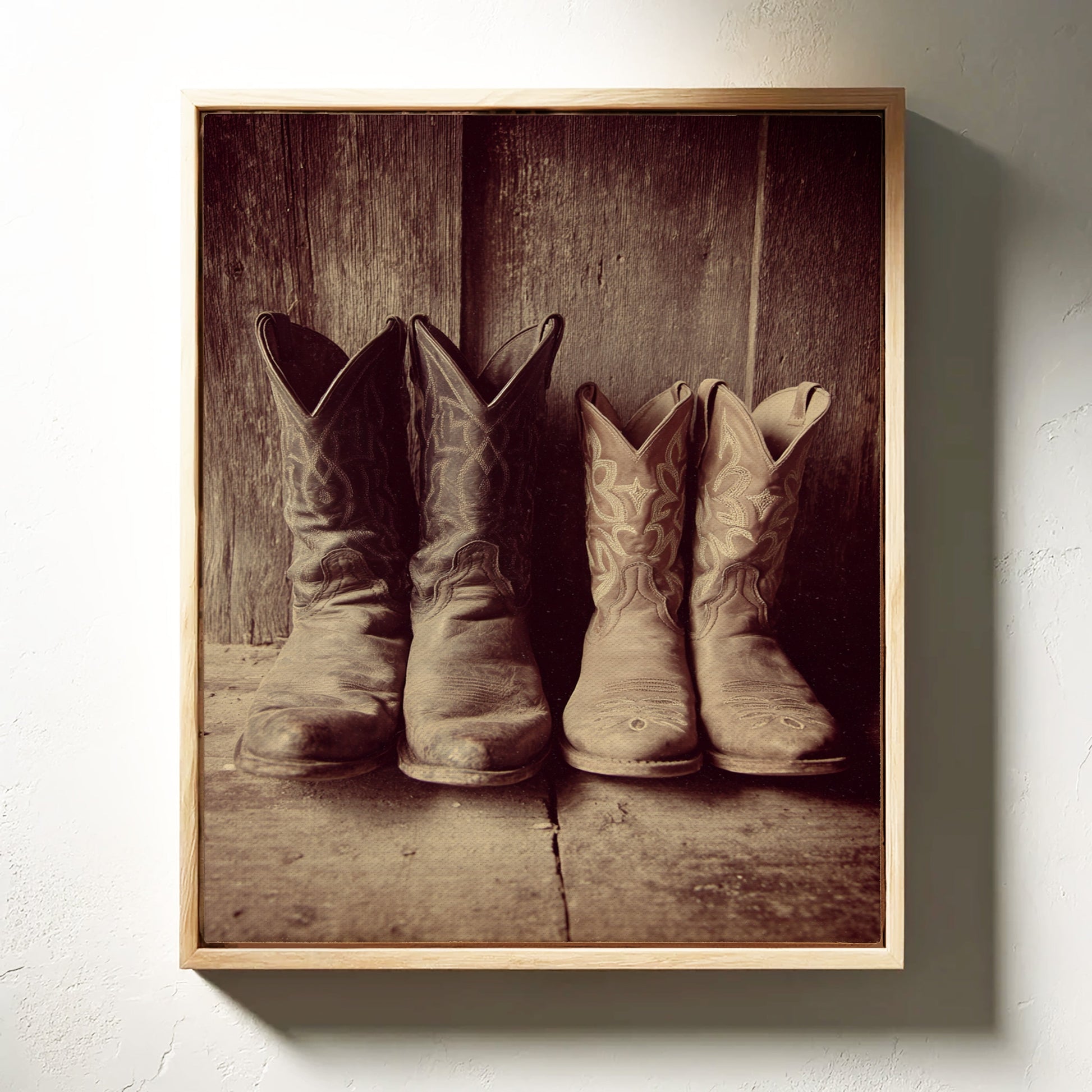 This photographic piece captures the essence of rustic Americana, drawing inspiration from the rugged beauty of the Wild West. The sepia tones lend an aged elegance, while the texture of the leather invites you to imagine the adventures these boots have seen.