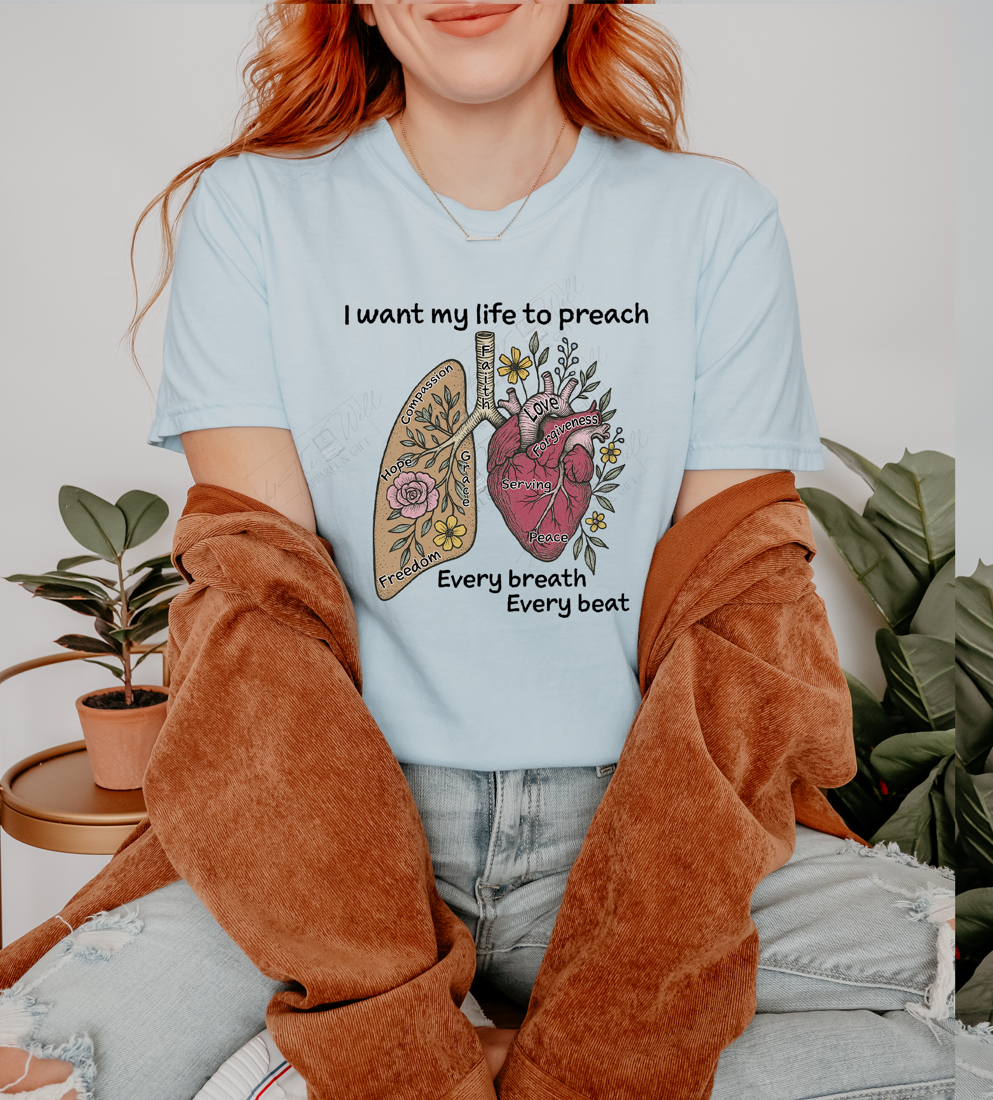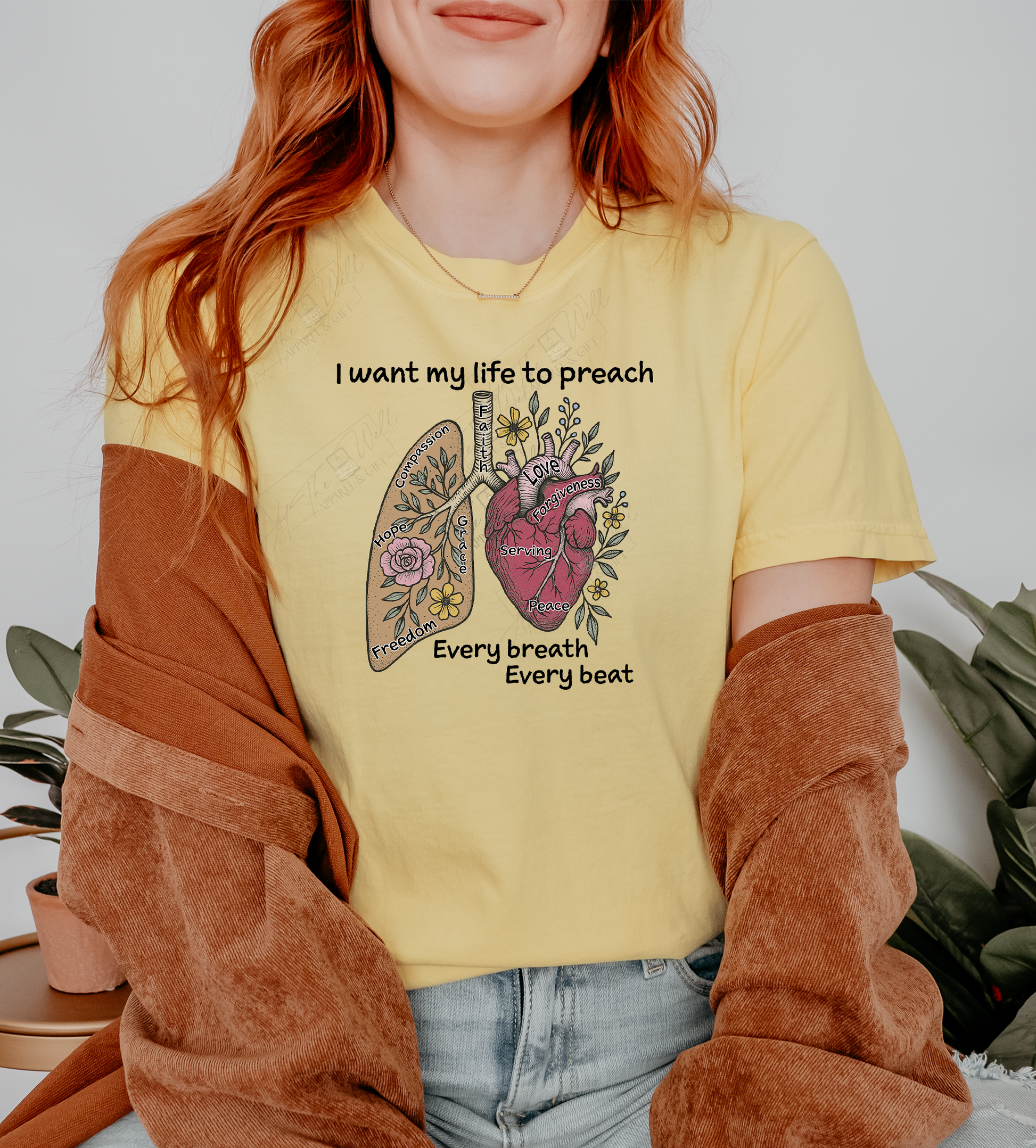 With artwork inspired by the powerful lyrics of the song Preach, this beautifully illustrated design pairs the lungs and heart, filled with the words: Faith, Hope, Grace, Love, Forgiveness, Peace, Freedom, Compassion, and more. It visually declares your desire to live intentionally—“Every breath. Every beat.”