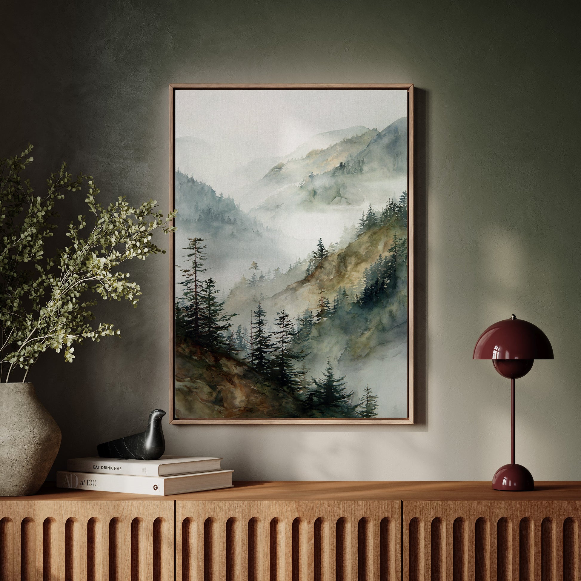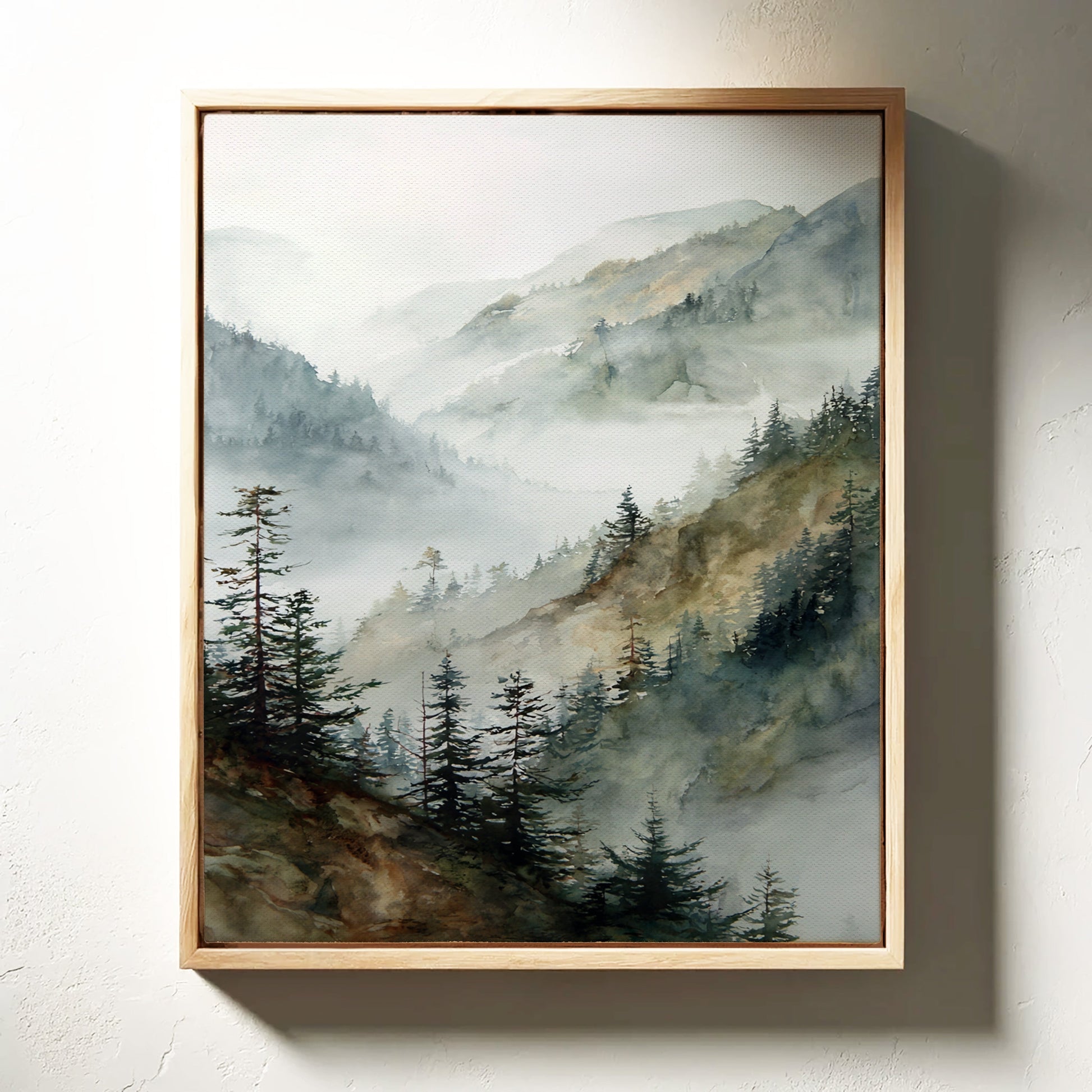 The soft, muted greens and blues blend seamlessly, evoking the cool touch of mountain air. The texture of the canvas adds a tactile quality, making the scene come alive in your space.