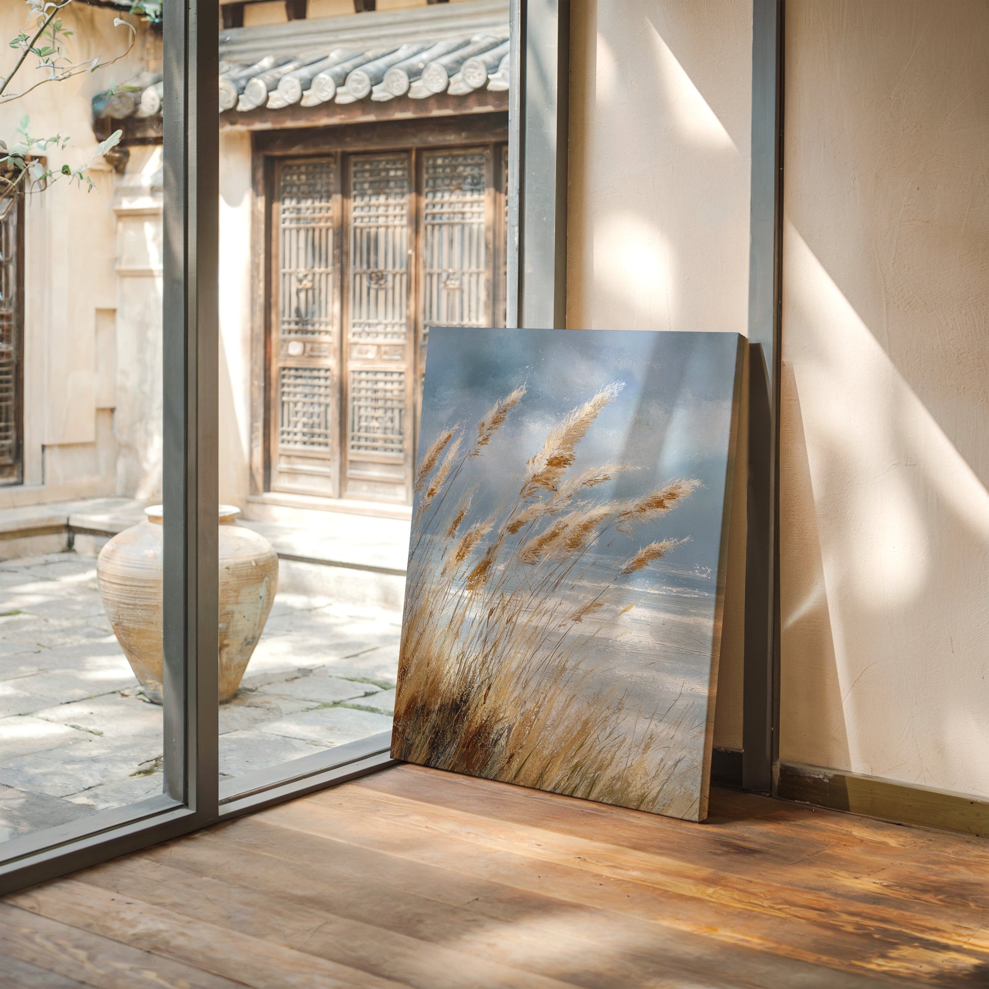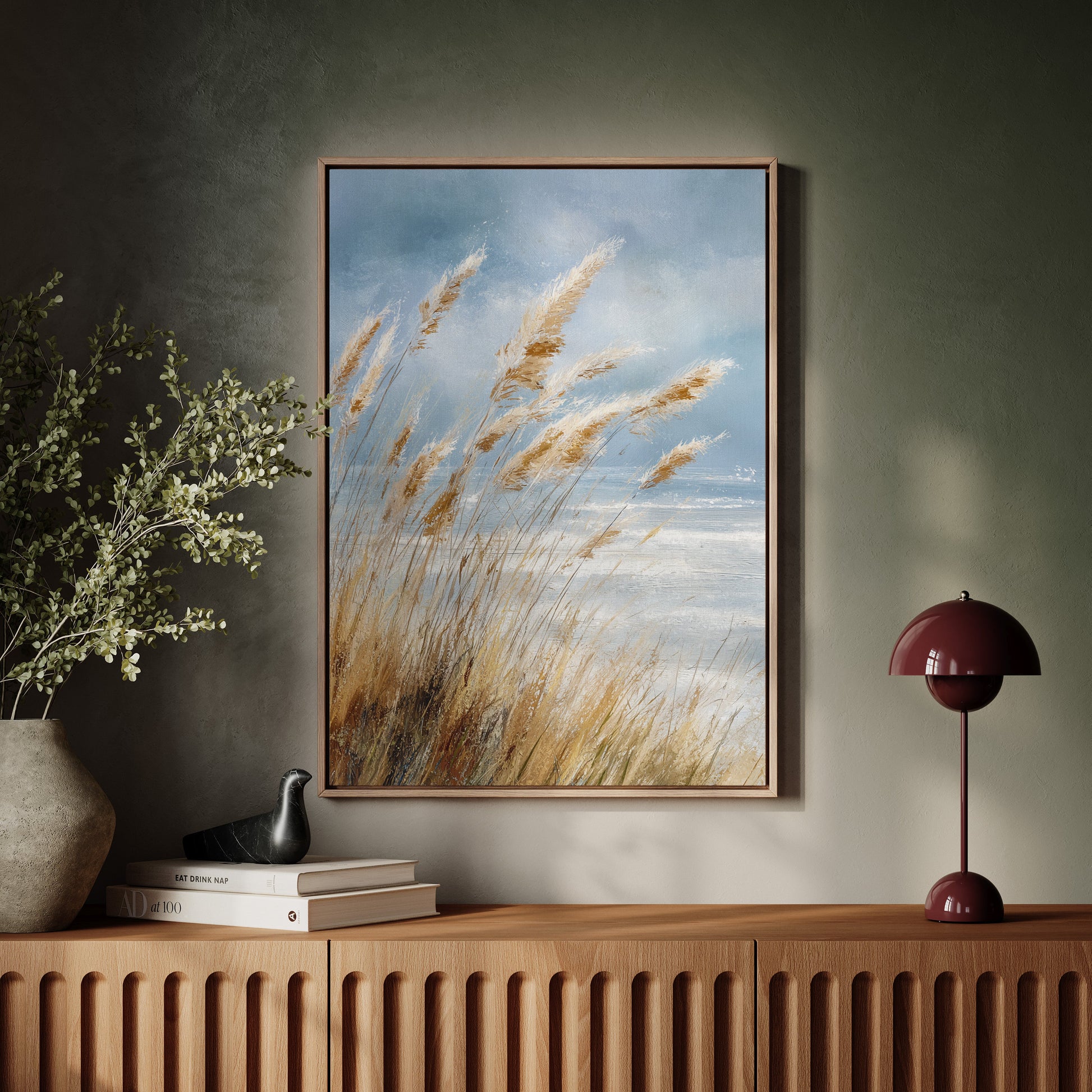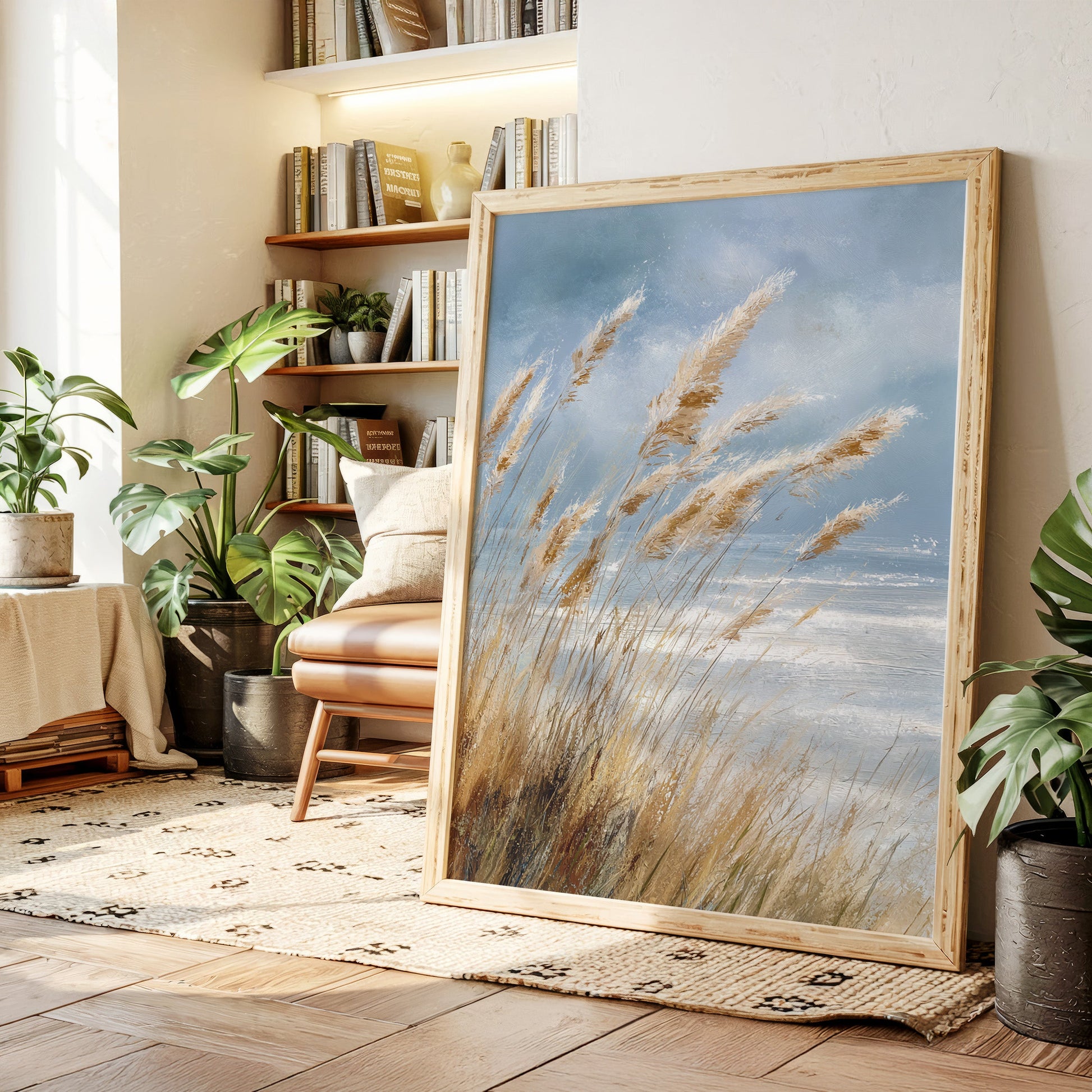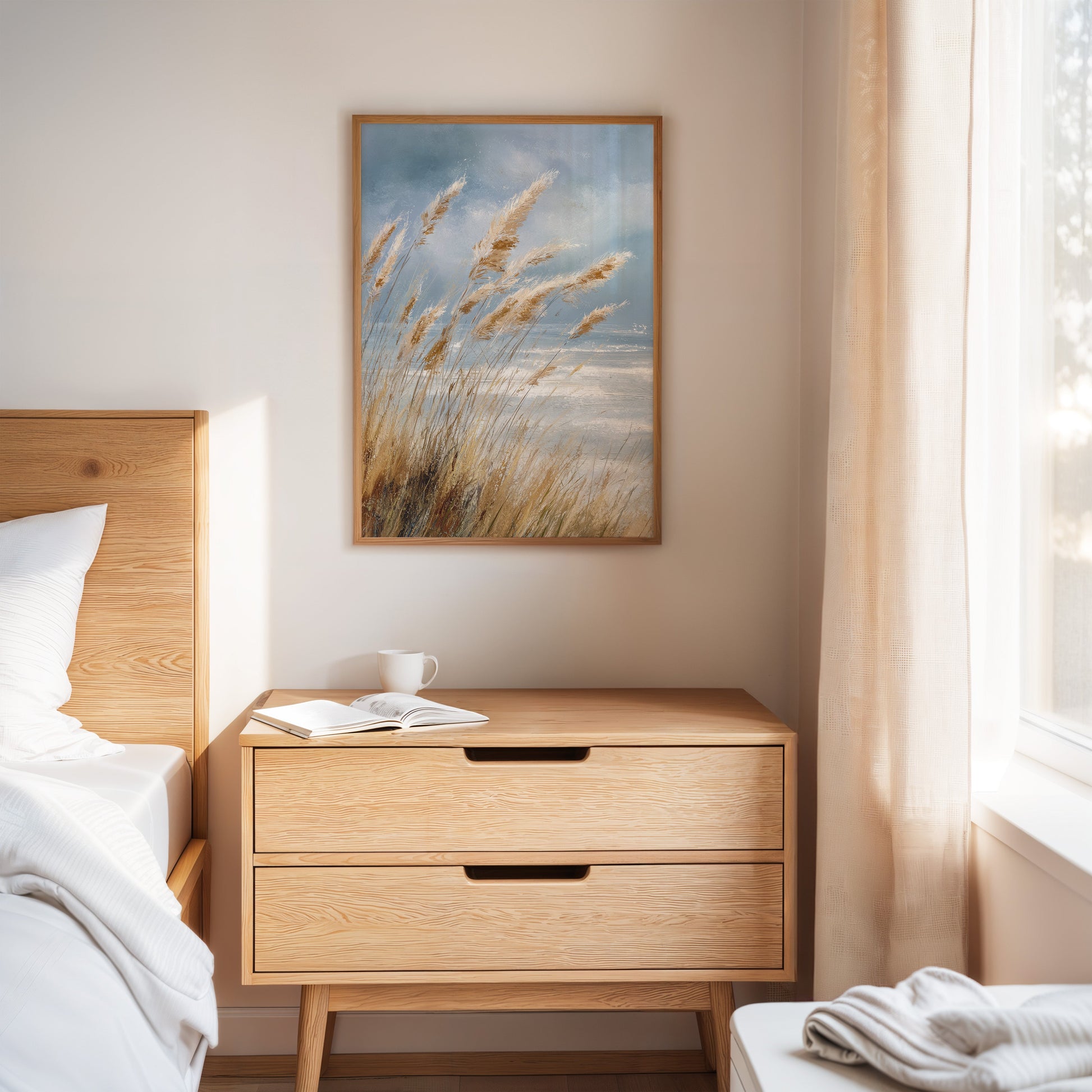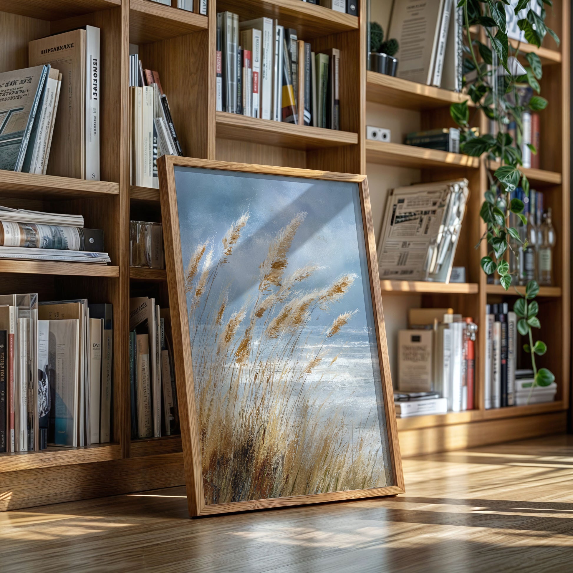 In a world that often rushes by, let the gentle sway of coastal grasses transport you to a place of calm and tranquility. This artwork captures the essence of a serene shoreline, where every breeze whispers tales of the sea.